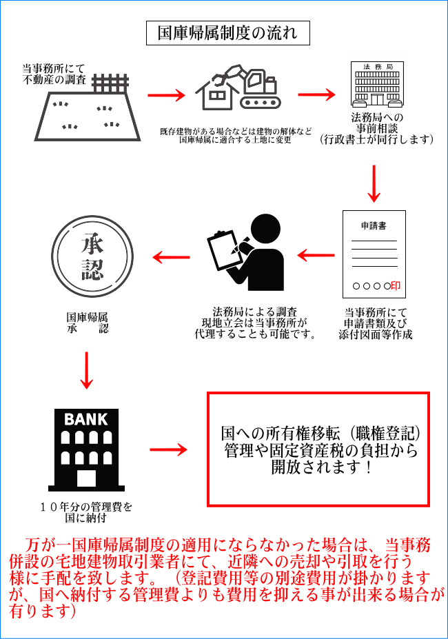 当事務所の行政書士は、不動産業界歴35年で現役宅地建物取引士です。国庫帰属制度が利用できるかどうかの調査から始め、現状では制度の対象にならない土地(建物が建っているなど)については、制度の対象となる土地への変更(例えば建物の解体撤去や整地)を手配し、又、本来の目的である「不動産の処分」を行う為に、売却できる可能性がある場合には、併設の不動産業者にて売却、売却が難しい場合には、隣接地所有者や近隣の方への不動産の引き取り依頼交渉を行うことも可能です。(併設不動産業者において実績が多数あります。対象土地の需給状況により変化致しますが、名義変更に必要な登記費用と不動産業者手数料は、多くの場合でご依頼者様の負担となるケースが多いです。但し、その場合であっても国庫帰属制度の利用よりも、費用が安く出来るケースが多く見受けられます。
