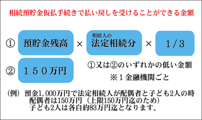※上限額(150万円/一金融機関・相続人お一人当たり)以上の払い戻しを受けたい場合には、家庭裁判所の手続き(保全処分・要調停、審判前置)を利用する必要がありますので、対応可能な法律事務所等をご紹介させていただきます。
